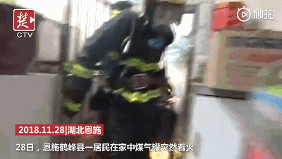 湖北恩施鹤峰县容美镇容美广场一居民在家中阳台上用煤气喷枪烧肉时,不慎将煤气罐引燃,喷出一米多的火舌。危急时刻,消防员在队友的水枪掩护下,徒手将“定时炸弹”从屋内拎出,移至空旷地带,对煤气罐进行冷却并稀释泄漏的煤气,成功化解险情。致敬“抱火哥”!