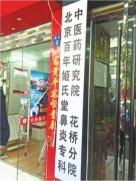 14日,位于江岸区育才街的“姬氏堂鼻炎馆”正在营业,高高的牌匾冠以“百年”二字,大门右侧赫然挂着“北京百年姬氏堂鼻炎专科中医药研究院花桥分院”的招牌,十分吸引眼球。货架上的产品琳琅满目,看起来与药品毫无二致,每一盒上面都写着消费者的名字,可见生意不差。市、区卫生计生执法督察大队仔细检查这些药膏,发现其准字号认证为“消”字号,准确理解应是“消毒品”,该店营业执照经营范围中也清晰注明消毒用品、保健用品,并明令“不含诊疗服务”。但是营业员对顾客的推销语是“上到鼻子里,就可以起到消炎、排毒、修复粘膜的作用。执法人员称:如果销售人员为顾客做检查,并自称其消毒产品有治疗作用,甚至“指导用药”,则此类营销行为涉嫌非法诊疗。