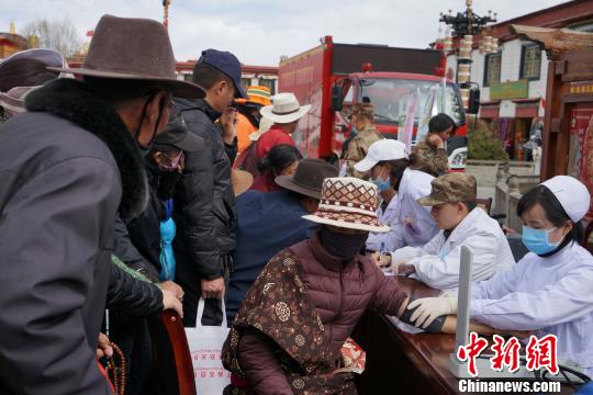 图为3月14日,西藏军区总医院医护人员为拉萨市民量血压。 张伟 摄