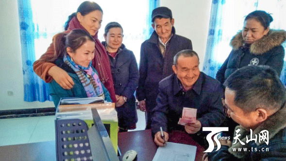 多力坤(右一)给务工人员发放工资,拿到工资的村民喜滋滋的。