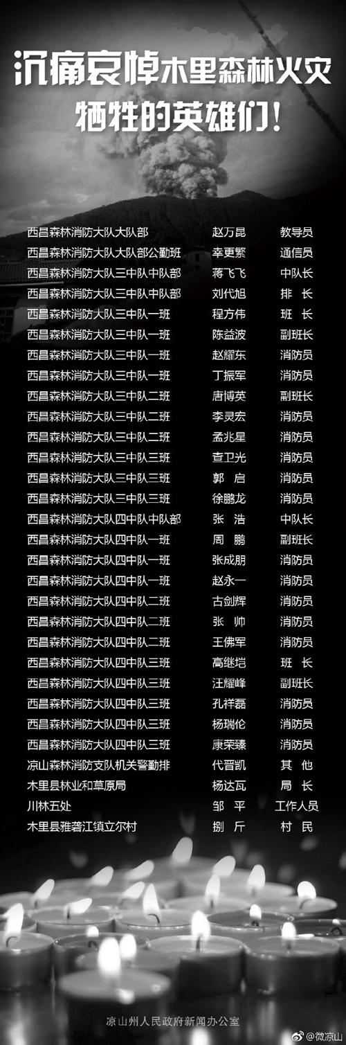 中新网4月2日电 3月30日,四川省凉山州木里县雅砻江镇立尔村发生森林火灾。3月31日下午,扑火人员在转场途中,受瞬间风力突变影响,突遇山火爆燃,30名扑火队员牺牲。4月2日中午,凉山州人民政府新闻办公室通过官方微博公布在火灾中牺牲的英雄名单: