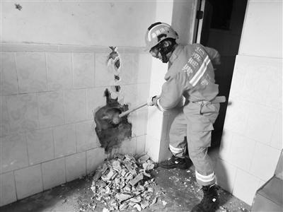 消防指战员和120医务人员引导孩子如何利用吞咽动作保护耳朵,并用长棍支起棉被保护小男孩的身体免受二次伤害。消防指战员清除表面瓷砖、水泥层后,从墙体下方往上进行破拆清除。经过大约1个小时的破拆,终于破拆到距离小男孩身体10厘米左右的位置,可以用手触摸碰到孩子。