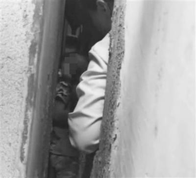 男孩卡在墙缝里动弹不得