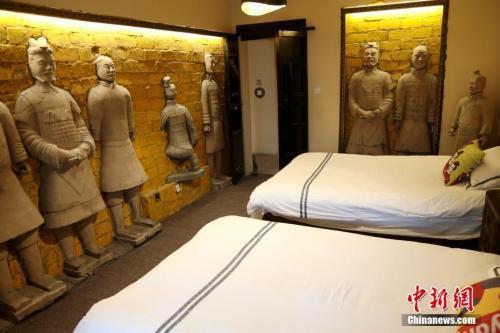 资料图:民宿卧室内的“兵马俑”装饰。近日,西安一家主打“兵马俑”元素的民宿走红,让不少旅客感叹如同居住在“秦始皇陵”。中新社记者 张远 摄
