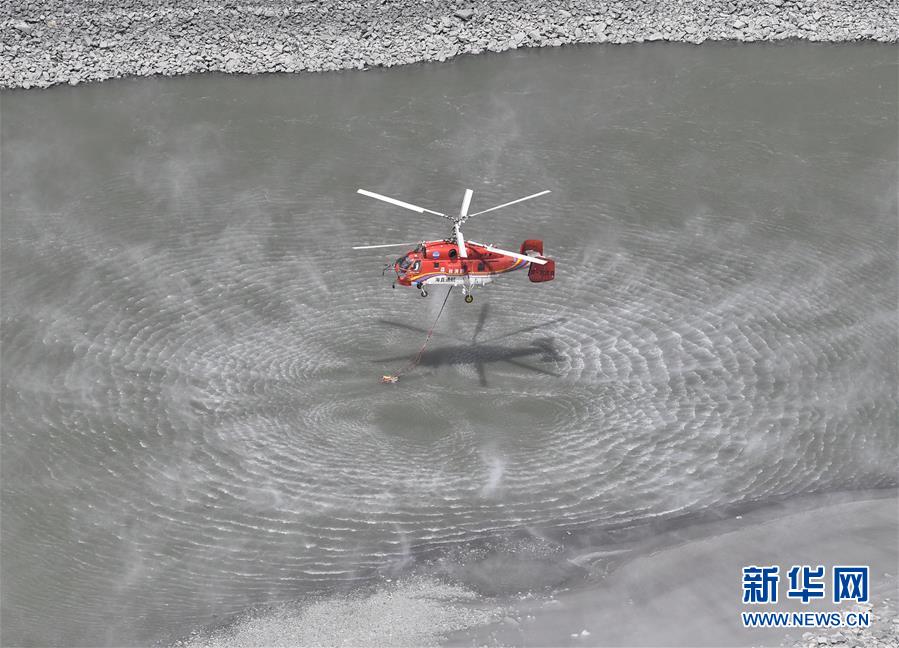 4月2日,救援直升机在火场附近河道内取水,准备进行空中灭火工作。新华社记者 刘坤 摄