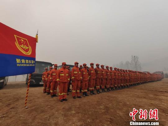 “中国消防救援队队旗”迎风飘扬,应急管理部森林消防局机动支队100余名消防指战员在贾庄村集结。 王曦 摄