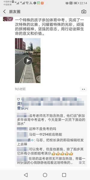 高艳能的成绩是3分50秒,在同组10人中排名倒数第一,距满分成绩差距不小,可他的坚持打动了所有人:微信朋友圈疯转他的视频,含泪看他跑完全程的监考老师破例给了他满分;学校也准备开会,让学生们学习一下他这种精神。