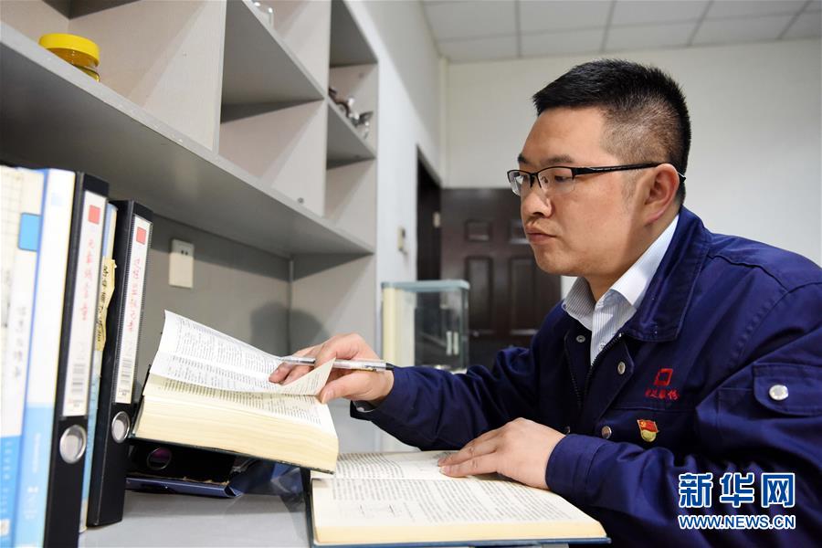 4月26日,在安徽铜陵精达特种电磁线股份有限公司,苏保信利用工余时间学习。 新华社发(过仕宁 摄)