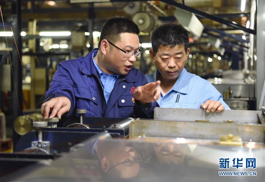 4月25日,在安徽铜陵精达特种电磁线股份有限公司技术中心实验室,苏保信(左)开展特种电磁线技术攻关。 新华社发(过仕宁 摄)