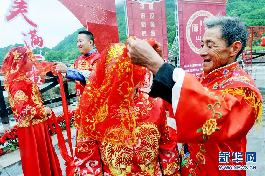 4月30日,在德兴市集体婚礼现场,金婚老人程师子(右一)和孙子程火根(左二),一同掀开爱人的红盖头。 当日,江西省德兴市为70对夫妻举行了集体婚礼,他们中不仅有刚刚喜结连理的新人,也有携手走过半生风雨的老夫妻。他们在现场观众的见证下,带着满满的祝福参加了婚礼仪式,用行动倡导文明节俭办婚礼。 新华社发(卓忠伟 摄)