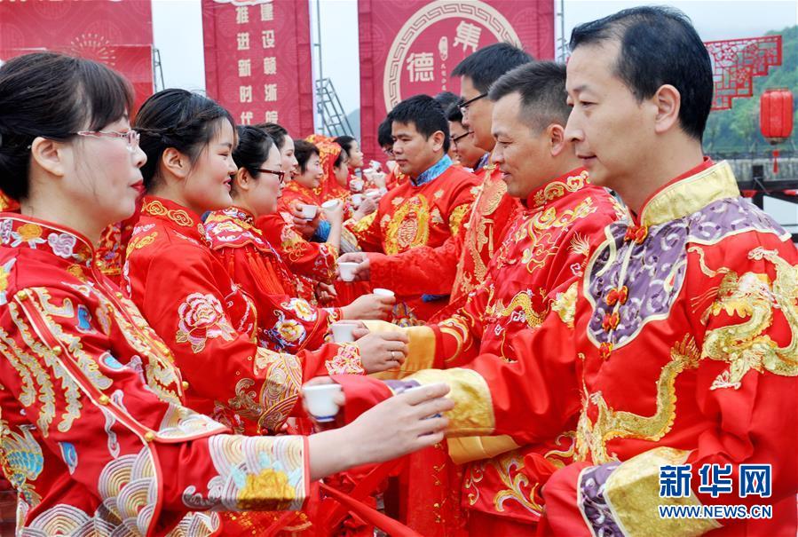 4月30日,参加集体婚礼的夫妻对饮交杯酒。 当日,江西省德兴市为70对夫妻举行了集体婚礼,他们中不仅有刚刚喜结连理的新人,也有携手走过半生风雨的老夫妻。他们在现场观众的见证下,带着满满的祝福参加了婚礼仪式,用行动倡导文明节俭办婚礼。 新华社发(卓忠伟 摄)