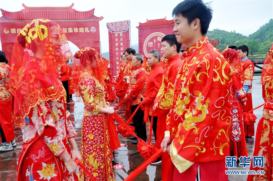 4月30日拍摄的德兴市集体婚礼现场。 当日,江西省德兴市为70对夫妻举行了集体婚礼,他们中不仅有刚刚喜结连理的新人,也有携手走过半生风雨的老夫妻。他们在现场观众的见证下,带着满满的祝福参加了婚礼仪式,用行动倡导文明节俭办婚礼。 新华社发(卓忠伟 摄)