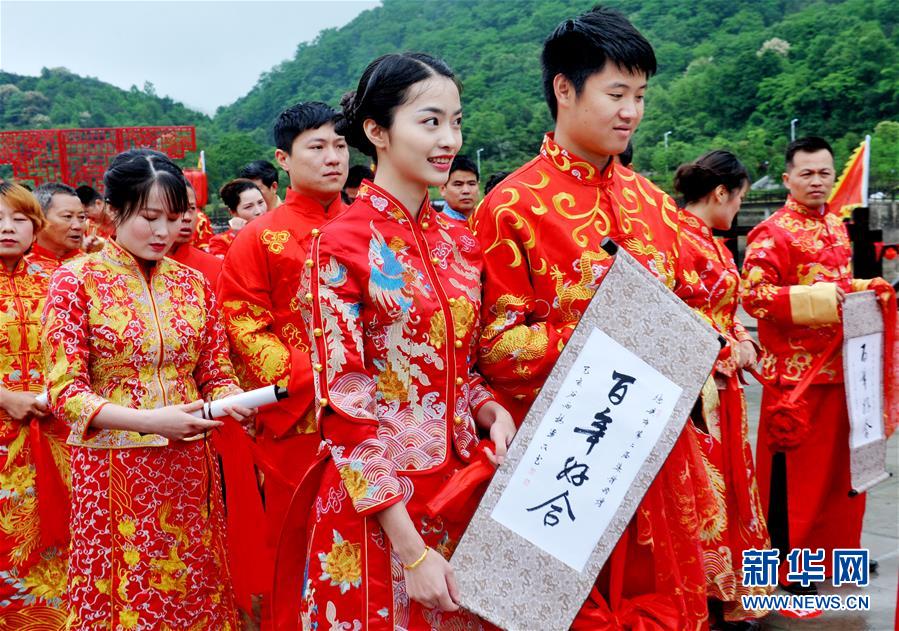 4月30日拍摄的德兴市集体婚礼现场。 当日,江西省德兴市为70对夫妻举行了集体婚礼,他们中不仅有刚刚喜结连理的新人,也有携手走过半生风雨的老夫妻。他们在现场观众的见证下,带着满满的祝福参加了婚礼仪式,用行动倡导文明节俭办婚礼。 新华社发(卓忠伟 摄)
