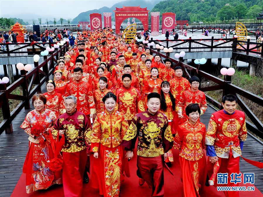 4月30日,参加集体婚礼的夫妻同走红毯。 当日,江西省德兴市为70对夫妻举行了集体婚礼,他们中不仅有刚刚喜结连理的新人,也有携手走过半生风雨的老夫妻。他们在现场观众的见证下,带着满满的祝福参加了婚礼仪式,用行动倡导文明节俭办婚礼。 新华社发(卓忠伟 摄)