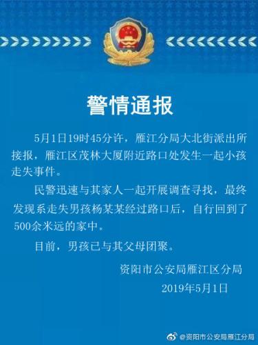 中新网客户端5月2日电 日前有网友爆料一则“妈妈耍手机,小孩被抢走”事件,引发关注。今日凌晨,四川省资阳市公安局雁江分局官方微博对此发布通报称,5月1日19时45分许,资阳市公安局雁江分局大北街派出所接报,雁江区茂林大厦附近路口处发生一起小孩走失事件。民警迅速与其家人一起开展调查寻找,最终发现系走失男孩杨某某经过路口后,自行回到了500余米远的家中。