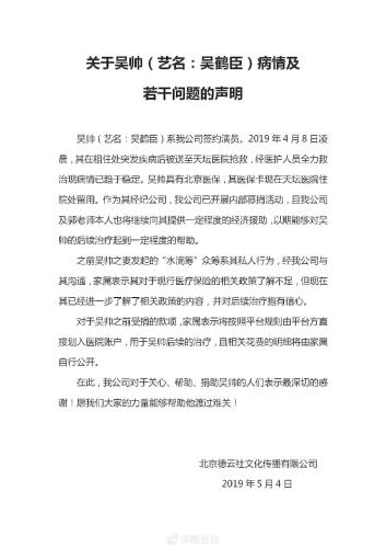 5月4日,德云社在官方微博发布关于吴帅(艺名:吴鹤臣)病情及若干问题的声明,声明称,吴帅之妻发起的众筹系其私人行为,德云社和郭德纲本人将继续向其提供一定程度的经济援助。