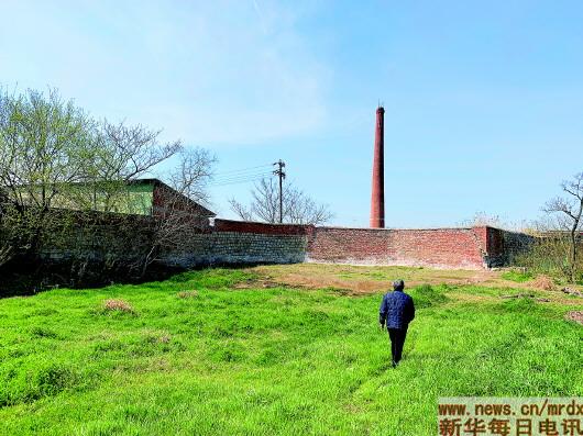 张功利走在自家的土地上。院墙那边正是废弃的九采罗化学有限公司厂址。本报记者屈彦摄