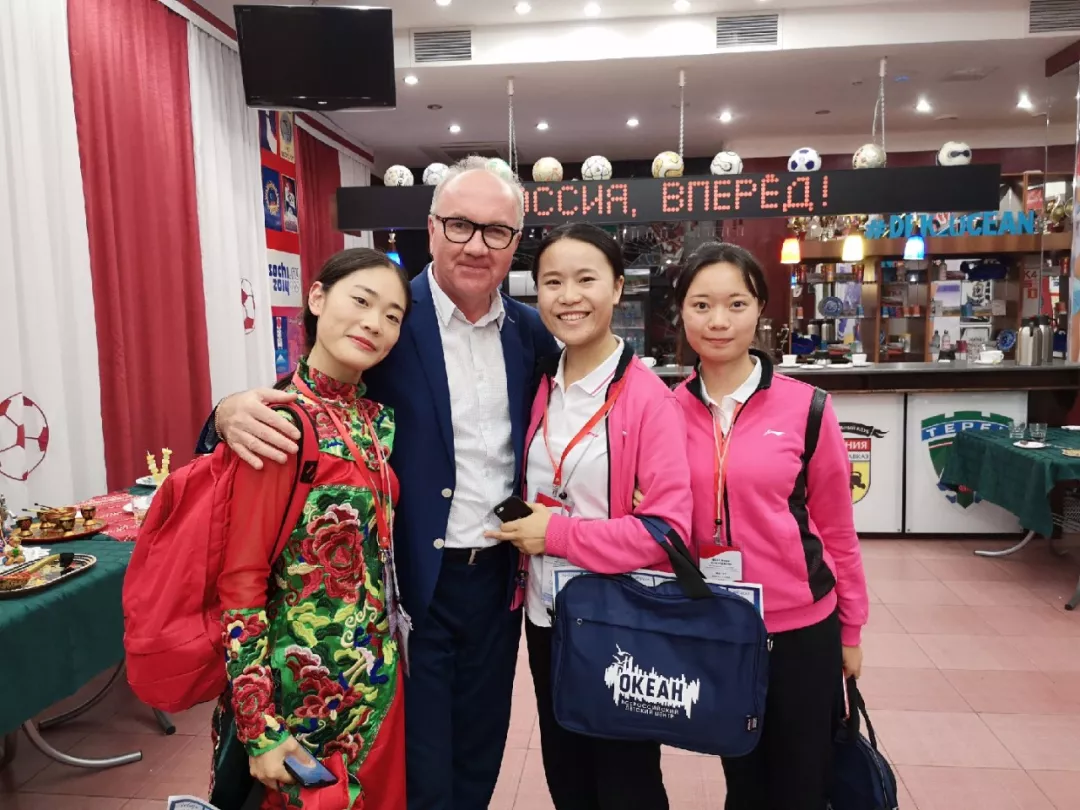 蔡文晴与俄罗斯“海洋”全俄儿童中心教职工的合照。受访者供图