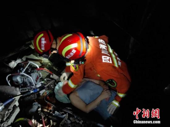 双河镇东街救援现场,宜宾支队6月18日凌晨1时许,发现一名女性被困人员,4时19分成功救出,目前,该名获救女性生命体征正常。文/中新社记者 刘忠俊 四川消防供图