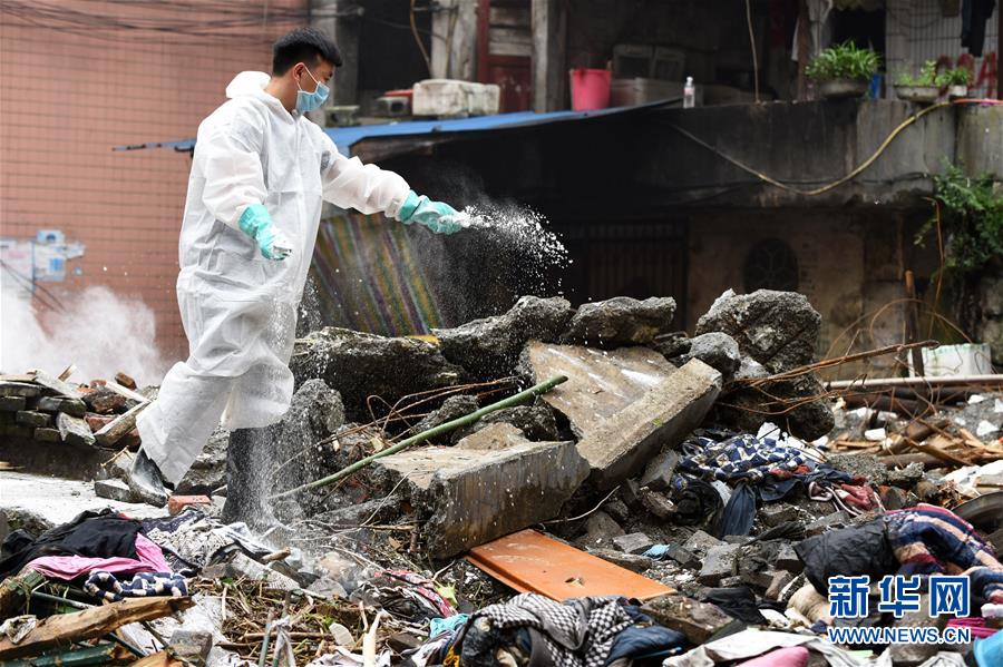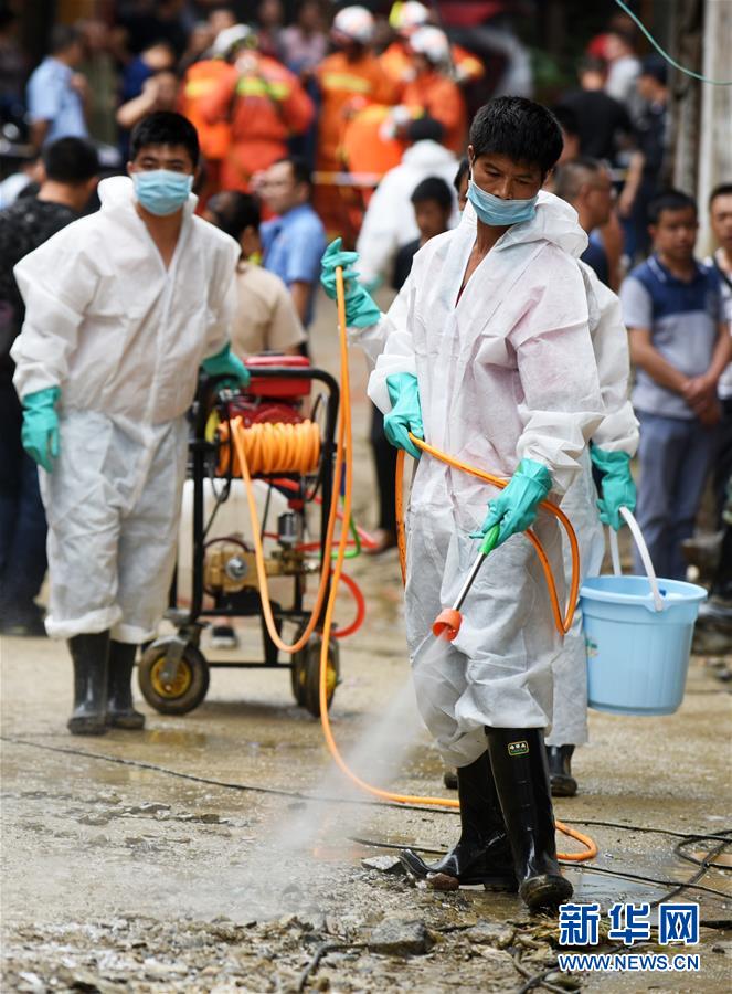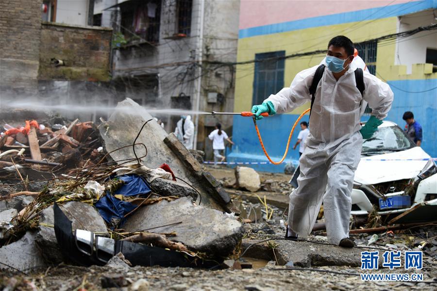 6月23日,在贵州省沿河土家族自治县县城,防疫工作人员对受灾现场进行防疫消毒。新华社记者 杨文斌 摄