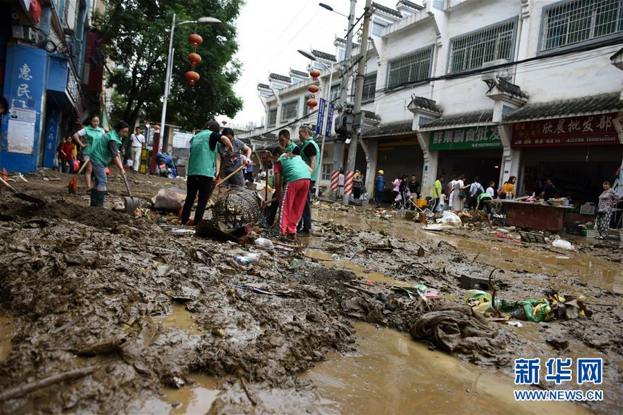 6月23日,在贵州省沿河土家族自治县县城,志愿者在街道清淤。新华社记者 杨文斌 摄