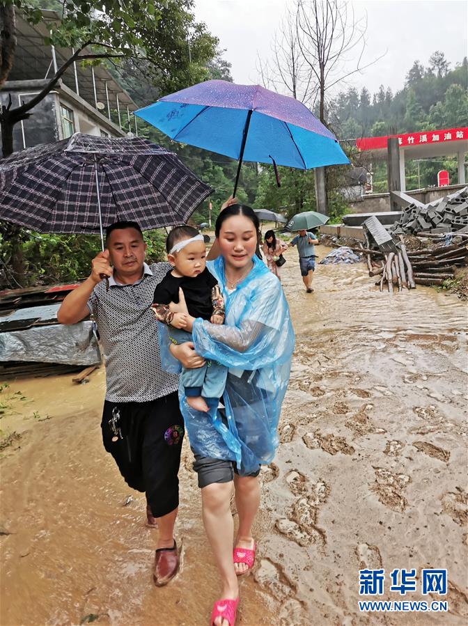 贵州省沿河土家族自治县黑水镇的乡镇干部(右)在帮助转移群众(6月22日手机拍摄)。新华社发(黎年珍 摄)