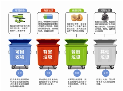 据悉,条例所称生活垃圾,是指单位和个人在日常生活中或者为日常生活提供服务的活动中产生的固体废弃物,以及法律、行政法规规定视为生活垃圾的固体废弃物。根据条例,生活垃圾分为四类:可回收物、有害垃圾、餐厨垃圾、其他垃圾。