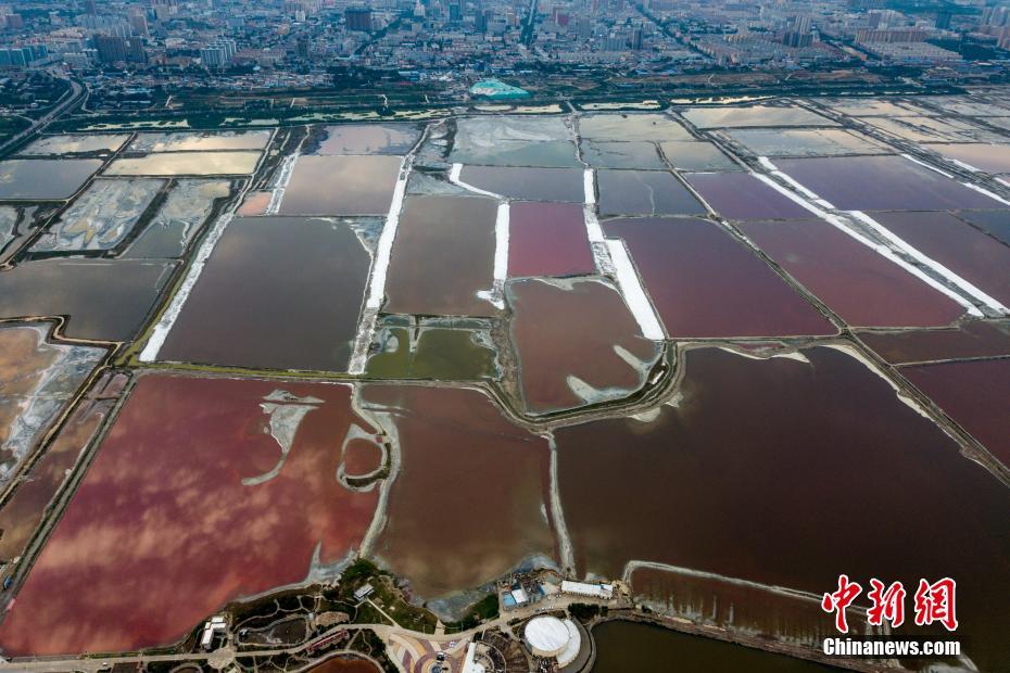 近日,运城市持续高温天气,运城盐湖的颜色随着水的浓度变化而变化,呈现出色彩斑斓的美景,成为夏日特有的一道风景。图为7月2日航拍山西运城盐湖。中新社记者 韦亮 摄