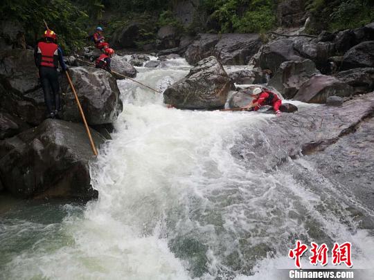 搜救人员在湍急的水流旁进行搜寻。 山福镇供图