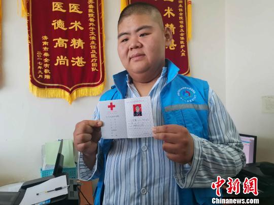 王浩楠已经成为中国红十字会志愿者,经常参加各种公益活动,科普肥胖危害、分享减肥经验,希望通过这种方式帮助更多“胖友”瘦身成功,拥有健康身体。图为王浩楠和他的志愿者证。 郝学娟 摄