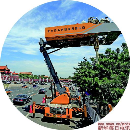 升降车抬起,卸下灯球、高压气枪清除污物、检查线路和器件、清洗灯球、安装灯泡……华灯班队员们动作娴熟、配合默契,俨然一条空中的流动生产线。