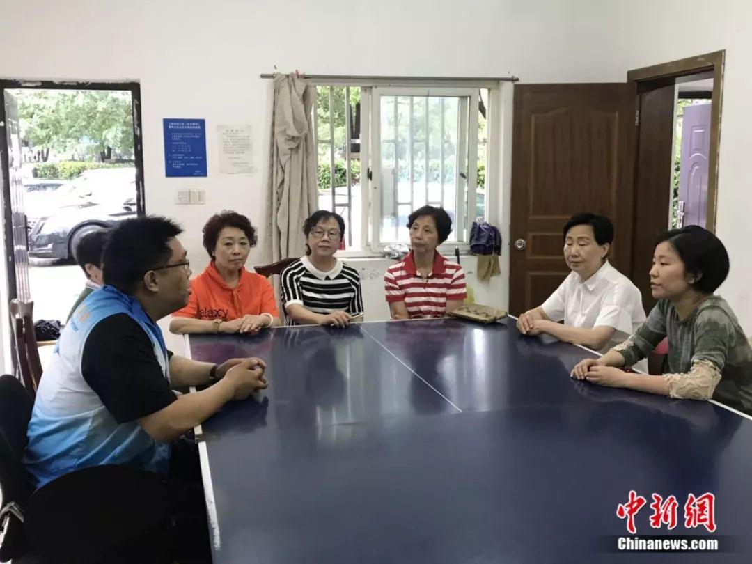 周春(右一)与居委负责人和志愿者探讨垃圾分类解决方案。王子涛摄