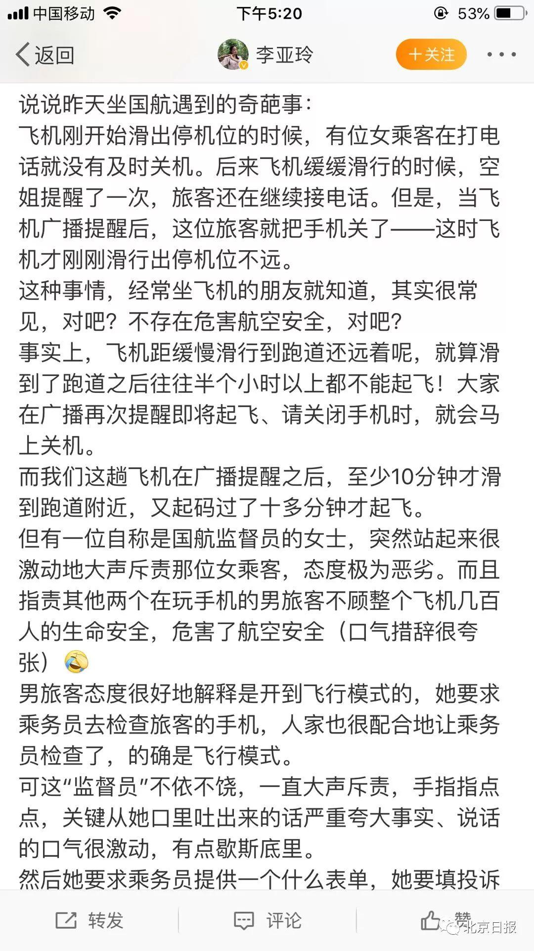 13日上午9时左右,李亚玲发布微博,披露一位自称是国航“监督员”的女士因其他乘客未及时关闭手机而大声斥责,并要求机组报警;航班降落后,被这位“监督员”举报的几名旅客被带到机场公安局滞留7小时。