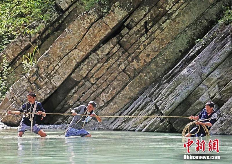 上午十点,当游客们来到河边,65岁的曹永毕“唰”地一下从“豌豆角”小船上站了起来,招呼纤夫们上阵,他们穿着草鞋、喊着号子、三人一组将纤绳挂在肩上,踩着溪边鹅卵石弯腰低头逆流行进。曹永毕唱着纤夫号子,身后拉纤的同伴们应声附和,苍凉的纤夫号子回荡在神农溪的山崖中。