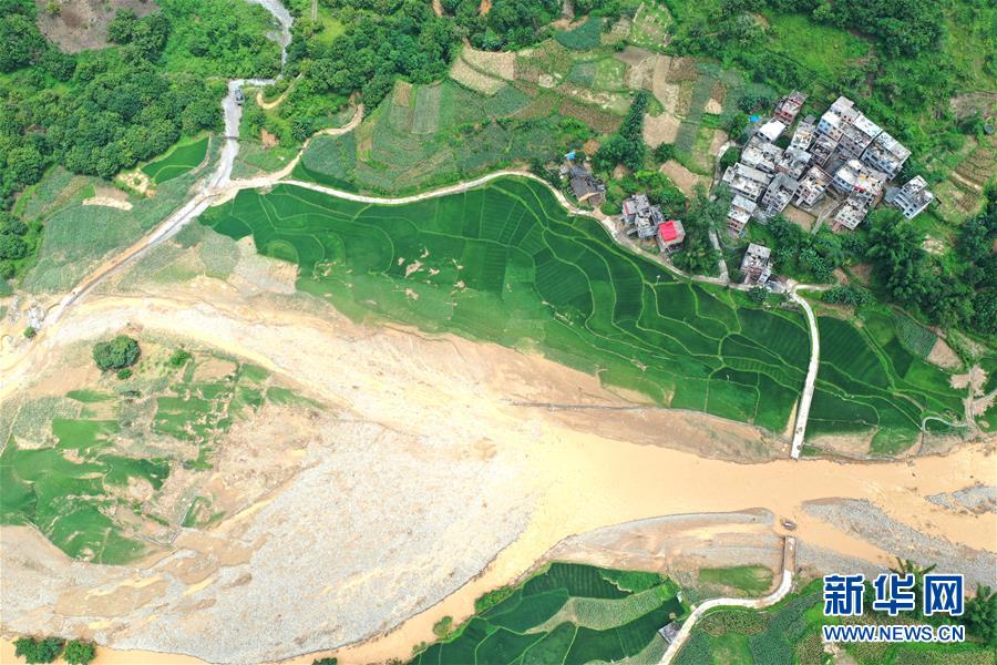 广西河池市东兰县隘洞镇坡拉村高更屯两条通屯道路均被洪水冲毁(7月16日无人机拍摄)。