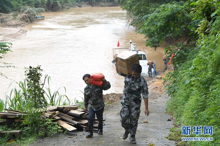 7月以来,广西河池市东兰县遭受两次强降雨袭击,全县14个乡镇均不同程度受灾。受强降雨影响,东兰县隘洞镇坡拉村高更屯被洪水围困,成为“孤岛”。 7月16日,隘洞镇民兵应急分队经过陆路、水路到达坡拉村高更屯,手提肩扛为被洪水围困的群众送去救援物资。 新华社记者 周华 摄