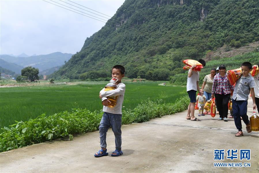 7月16日,广西河池市东兰县隘洞镇坡拉村高更屯村民拿着刚刚领取的救灾物资回家。