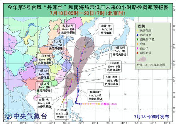 今年第5号台风“丹娜丝”(热带风暴级)的中心今天(18日)早晨5点钟位于台湾岛台东市东偏南方大约305公里的西北太平洋洋面上,就是北纬22.0度、东经124.0度,中心附近最大风力有8级(18米/秒),中心最低气压为994百帕,七级风圈半径200-300公里。