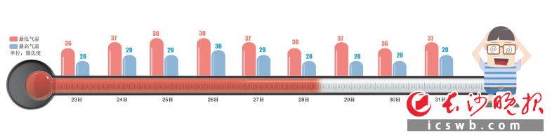 根据市气象台具体预报,7月23日至31日,长沙以多云或晴天为主,午后到傍晚有分散性的雷阵雨天气,最高气温持续在35℃以上,甚至38℃至39℃。这意味着,长沙不仅最高气温超过35℃,高温天数持续7天以上,而且最低气温也在28℃、29℃,夜间炎热丝毫没有缓和,可谓“火力”十足。