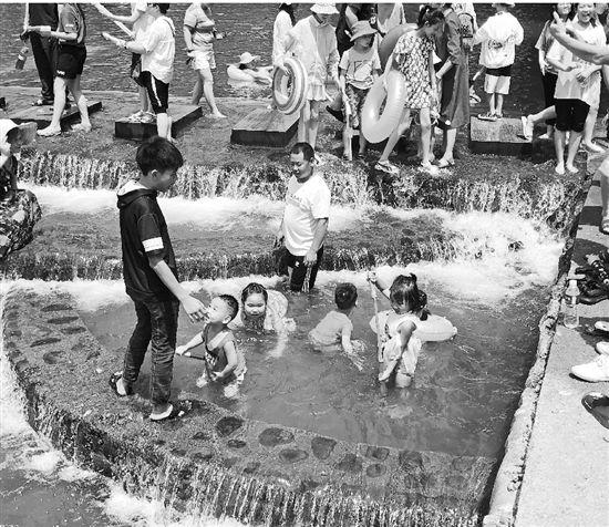 龙鳞坝的鳞形水池里的水只有成人小腿深,小朋友在里边玩耍很安全。而水坝上方的水相对较深,一般达到成人胸部位置,下方水深在成人大腿位置。大多数游客都在鳞形水池中游玩,少数大人在水较深的水域游泳。确实有不少孩子自己在水中游玩,旁边并没有大人。钱报记者也询问了一些游客,他们有的还不知道有人溺水。