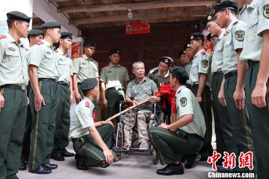 42代扁担传人何科龙将象征奉献与爱心的扁担郑重交到43代传人农丰赫的手中,同时也交接了照顾老人的任务。何科龙是武警中队第42代扁担传承人,入伍已经五年,今年将退伍复员。这几年,平时每逢节假日只要有空,他都会和战友们到吴陈忠家里,替他扫扫地、煮饭,陪他聊天,长期以来,建立起了亲人般的关系。离别在即,心中也十分不舍。