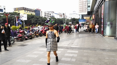 而录制作品的时候,豆小刚经常会选择在中心城区的广场上,每一次,身着奇装异服的豆小刚一亮相,广场上散步的人群就如潮水般“哗”地一下围过来,有人拿着手机跟拍起来,还有人追着豆小刚并排走着。所到之处,无一不是镜头的焦点,大妈大爷们手机上的快门声、闪光灯,恍若一场时装秀现场。