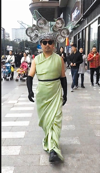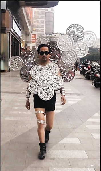 他是众人眼中的异类:一个蓄着胡子的中年男子,身着用花生、锅碗瓢盆、扫把、雨伞、窗帘、电脑键盘等物品制成的奇装,上演街头走秀