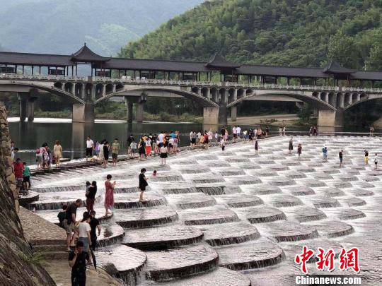 中新网杭州7月30日电(钱晨菲 翁娴)37摄氏度高温下,杭州市富阳区湖源乡的乡间道路停满了外地车辆。龙鳞坝边,“打卡”的游人熙熙攘攘,站满了整条堤坝。