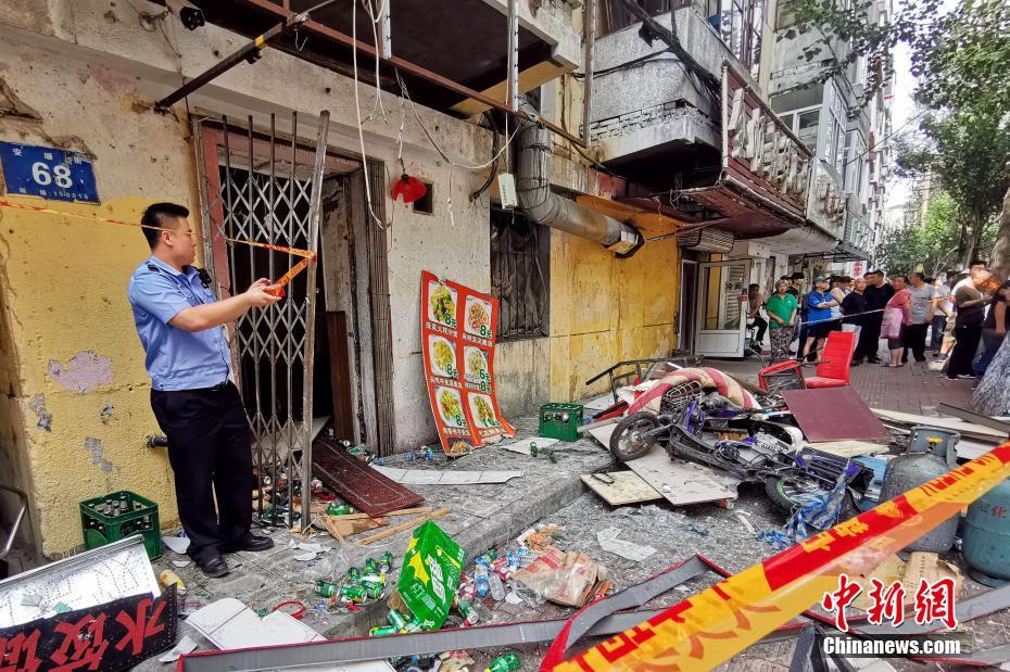 8月5日早8时左右,位于哈尔滨市道里区安顺街的一家餐馆发生疑似燃气爆炸,现场一片狼藉,爆炸震碎二楼楼板,一老人坠落受伤,餐馆老板娘受伤严重,目前两人已被送往医院就医。图为事发餐馆门口。中新社记者 范英杰 摄
