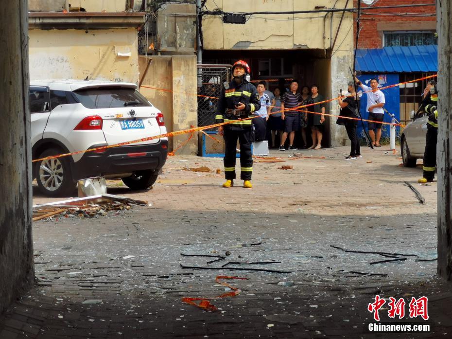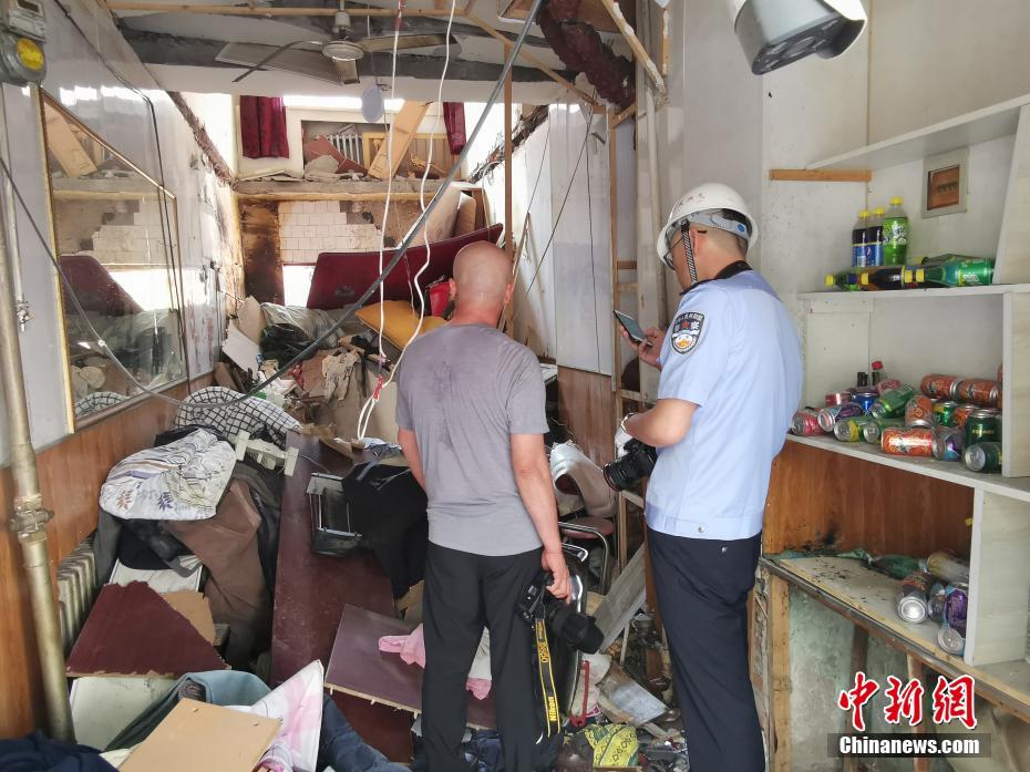 8月5日早8时左右,位于哈尔滨市道里区安顺街的一家餐馆发生疑似燃气爆炸,现场一片狼藉,爆炸震碎二楼楼板,一老人坠落受伤,餐馆老板娘受伤严重,目前两人已被送往医院就医。爆炸造成路边多辆车辆受损,附近居民楼玻璃被冲击波震碎。中新社记者 范英杰 摄