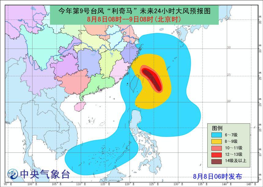 大风预报:8日8时至9日8时,江苏南部沿海、长江口区、浙江沿海、福建中北部沿海、台湾岛沿海、台湾海峡、台湾以东洋面、东海大部、钓鱼岛附近海域、南海南部和中部偏东海域、巴士海峡的风力将逐渐加大到6-8级,其中台湾岛北部沿海、台湾以东洋面、东海南部的部分海域的风力有9-12级大风,“利奇马”中心经过的附近海域的风力可达13-16级,阵风16-17级。