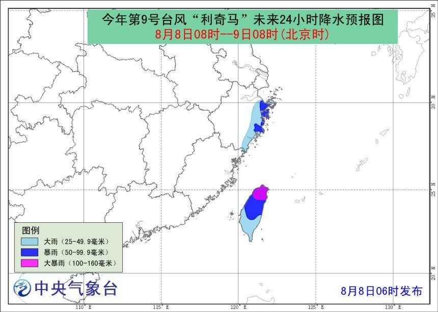 降水预报:8日8时至9日8时,浙江东部、台湾岛等地的部分地区有大雨或暴雨,其中台湾岛北部局地有大暴雨(100~160毫米)。