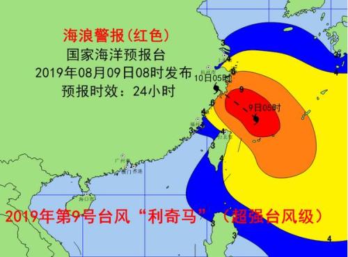 受今年第9号台风“利奇马”(超强台风级)影响,预计:8月9日中午到10日中午,东海南部、钓鱼岛附近海域将出现9到14米的狂涛到怒涛区,东海北部将出现5到7米的巨浪到狂浪区,近海海浪预警级别为红色;浙江近岸海域将出现5到7米的巨浪到狂浪,该近岸海域海浪预警级别为红色,福建北部近岸海域将出现3到5米的大浪到巨浪,该近岸海域海浪预警级别为橙色,上海近岸海域将出现3到4.4米的大浪到巨浪,该近岸海域海浪预警级别为黄色,江苏南部近岸海域将出现2.5到3.4米的大浪,该近岸海域海浪预警级别为蓝色。