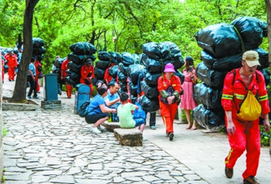 保洁员们背着垃圾下山。 陆军摄
